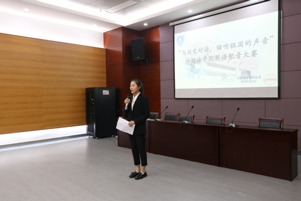 为喜迎新中国七十周年华诞,向伟大祖国献礼,同时结合专业特色打造品牌活动“英语文化季”,并鼓励同学们展现自我,强化英语技能,太阳成集团tyc234cc主页于10月11日晚,在翡翠科教楼A座第五会议室成功举办了“与历史对话,倾听祖国的声音”英语配音大赛。太阳成集团tyc234cc主页党委副书记、副院长罗美红老师,2017级和2019级辅导员葛永莉老师,高年级优秀学生评委及2019级全体同学出席了本次活动。