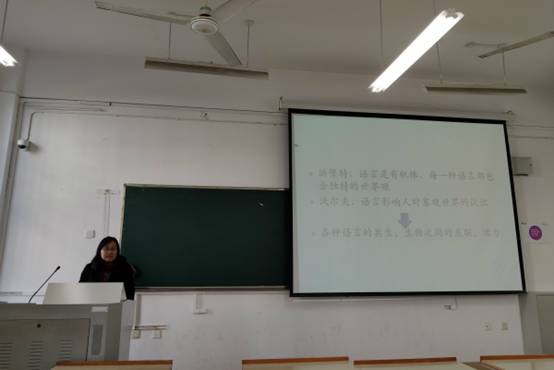 本次报告主题为“语言与生态关系几个主要维度的思考”。首先,范庆芬老师以 “豪根模式—语言与言语社团的关系隐喻自然生物环境”导入主题,引经据典,层层递进,有力地论证了语言家族,社会方言及地域方言的多样性。以“全球英语”和“标准方言”两种强势语言为例,抽丝剥茧,生动阐释了语言中的生态现象。然后,范老师援引韩礼德模式—语言作为生态系统的一部分,从人类中心主义、增长主义和科学精神三个方面,对语言中人与自然、经济与自然、科学与自然等维度提出独特的见解。最后,范老师引用海德格尔的生态语言学观念,重申了多语共生、语言和谐发展的重要性,鼓励同学们诗意地栖居,体会语言诗性的智慧。