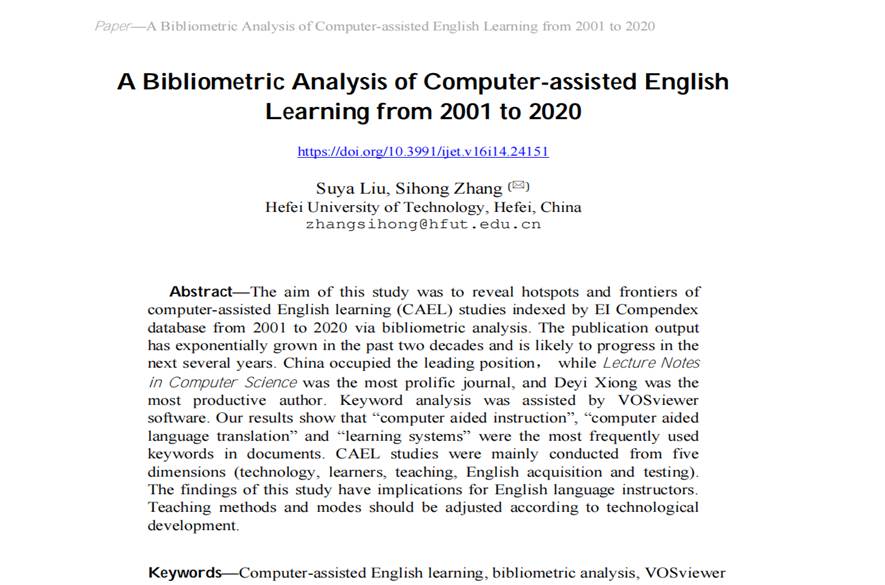 近日,太阳官网2018级本科生刘素雅同学在授课教师的指导下,以第一作者在EI核心期刊International Journal of Emerging Technologies in Learning发表题为“A Bibliometric Analysis of Computer-assisted English Learning from 2001 to 2020”(《计算机辅助英语学习的文献计量分析(2001-2020)》)的研究论文。文章以“计算机辅助教学”、“计算机辅助语言翻译”及“学习体系”等为检索关键词,运用VOSviewer软件,对EI核心期刊库进行检索并进行文献计量分析,发现自2001至2020年20年间,相关文献呈指数级增长,并可能在未来几年内会取得更大进展,同时指出,未来的英语教学方法及模式应根据技术发展进行相应调整。